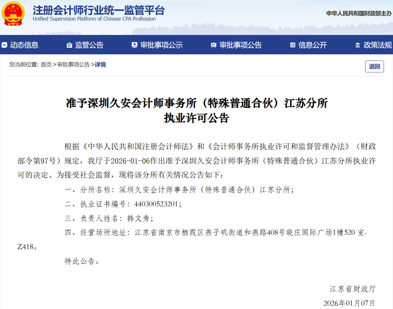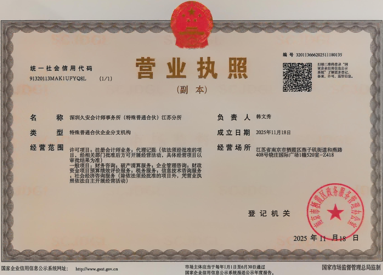 2026年1月7日,深圳久安会计师事务所(特殊普通合伙)江苏分所取得江苏省财政厅颁发的分所执业证书,深圳久安会计师事务所(特殊普通合伙)江苏分所正式设立并执业。