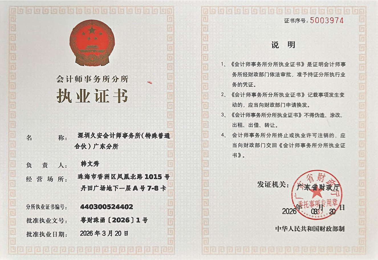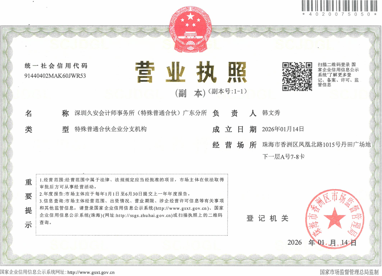 2026年3月20日,深圳久安会计师事务所(特殊普通合伙)广东分所(珠海)取得广东省财政厅颁发的分所执业证书,深圳久安会计师事务所(特殊普通合伙)广东分所(珠海)正式设立并执业。